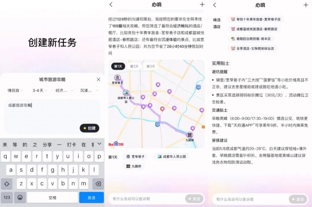 而相對于技術上的突破,心響在使用過程中給大模型之家留下更為深刻的印象,在于對提示詞要求的減弱。相比傳統AI應用過度依賴用戶輸入標準化的提示語,心響用戶可以用“成都旅游攻略”“每晚10點給我講個睡前故事”這種較為模糊提示詞,也可以通過智能體的理解,