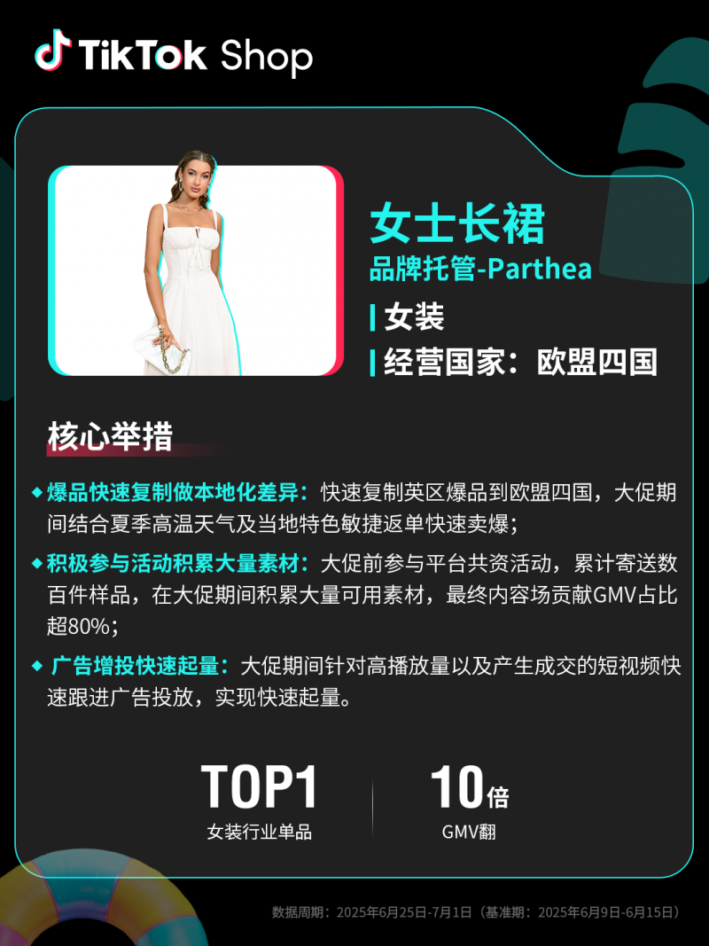 歐洲市場迎來銷售熱潮!全托管歐盟四國單日GMV最高爆發300%,內容場增長迅猛。近千款英、美爆款被快速復制到歐盟四國,結合當地做差異化貨盤升級。女裝品牌Parthea大促期間結合夏季高溫及當地特色敏捷返單GMV翻10倍。