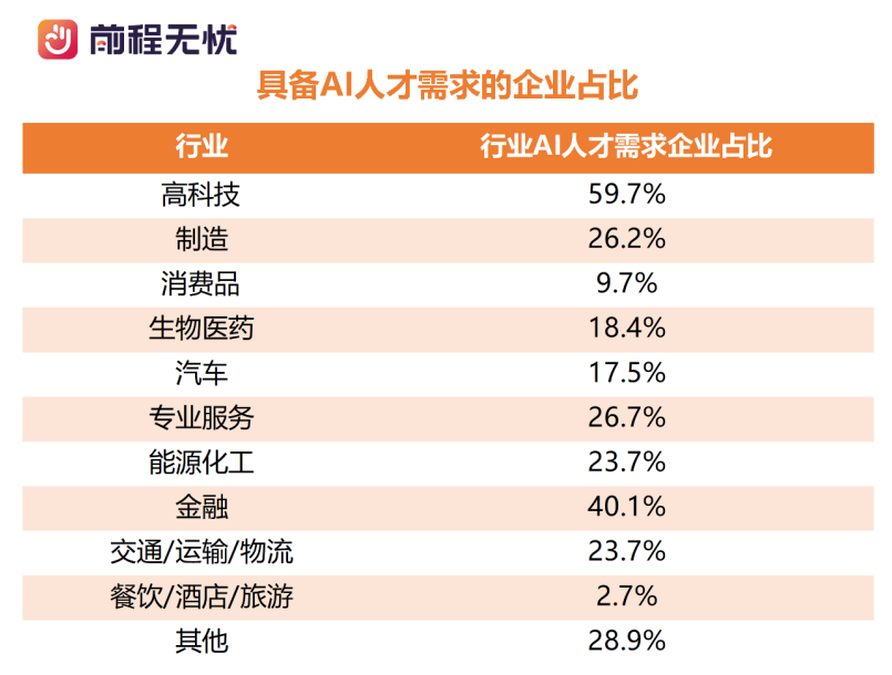 來自前程無憂人力資源調研中心的數據顯示,近60%的高科技企業已將AI人才納入核心招聘目標,其創新驅動發展的特性決定了對AI人才的剛性需求,遠超金融(40.1%)和專業服務業(26.7%)。餐飲/酒店/旅游業核心崗位以人工服務為主,多數企業更傾向于維持現有服務模式,對AI人才吸納能力相對有限。