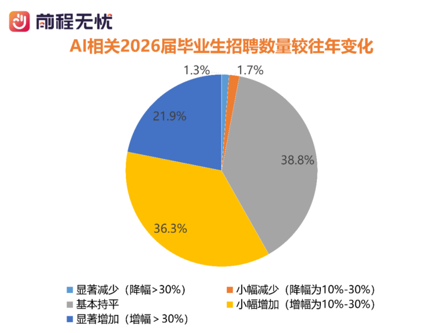 AI正在重構應屆生崗位圖譜,技術含金量決定需求彈性。前程無憂的調查顯示,近六成企業對AI技術研發類崗位應屆生需求有所增長,35.6%的企業對技術支持類崗位應屆生需求有所上升,而20.3%的企業縮減基礎客服等標準化或重復性崗位應屆生編制。