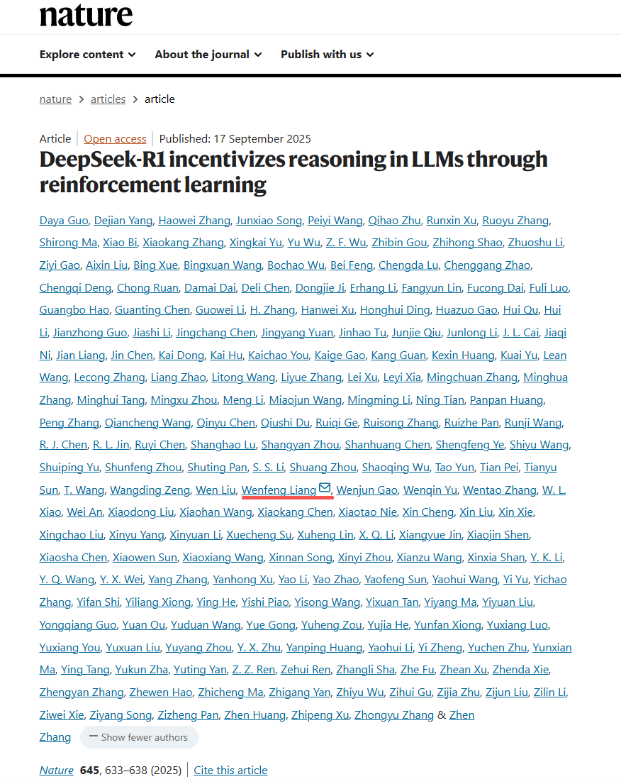 速途網9月18日訊(報道:龍翔)中國AI團隊 DeepSeek 再獲突破 —— 其核心團隊完成、梁文鋒任通訊作者的 DeepSeek-R1 推理模型研究論文,不僅登上國際權威期刊《自然》封面,DeepSeek-R1更成為全球首個經獨立同行評審的主流大語言模型,填補行業關鍵空白。