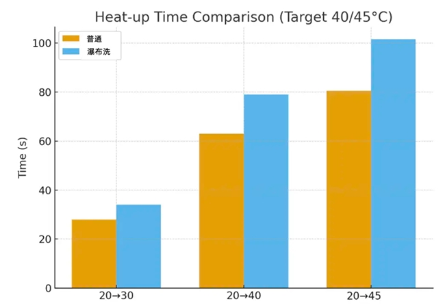 熱水器的第一項關鍵測試,是升溫速率。它決定了從擰開水龍頭到熱水真正流出,要等多久。這個時間看似只是幾秒鐘,卻直接影響使用體驗:時間越長,就要浪費更多冷水,也意味著我們得多「罰站」幾秒。實測發現,萬和安睡洗 V9S TURBO 的升溫速度普遍較快,基本能在半分鐘左右達到設定溫度。答主 @Cecilia 在室溫 20~24℃、自來水常溫約 20℃ 的環境下,用直插式電子溫度計和秒表進行記錄。她設定了 20→30℃、30→40℃ 兩個區間,結果顯示普通模式下前者約需 28 秒、后者約 35 秒;瀑布洗模式下前者約 34 秒、后者約 45 秒。