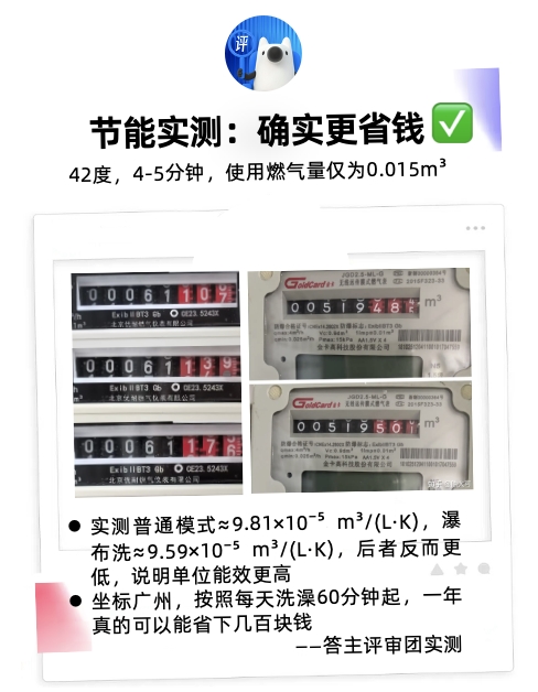 在測試相同出水溫度(40℃)下熱水器的單位能耗時,多名答主采用燃氣表+流量計組合的專業測量方法,得出令人驚訝的結論:瀑布洗模式,盡管提供了更大的水流量,但其單位能效竟然優于普通模式。