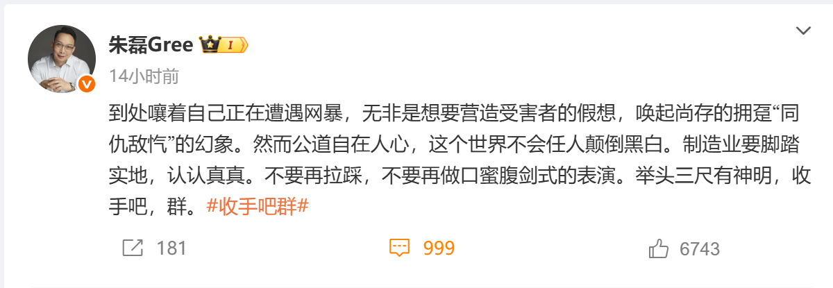 速途網(wǎng)10月20日消息(報(bào)道:李楠)近日,格力電器市場(chǎng)總監(jiān)朱磊發(fā)布微博稱,到處嚷著自己正在遭遇網(wǎng)暴,無非是想要營造受害者的假想,喚起尚存的擁躉“同仇敵愾”的幻象。