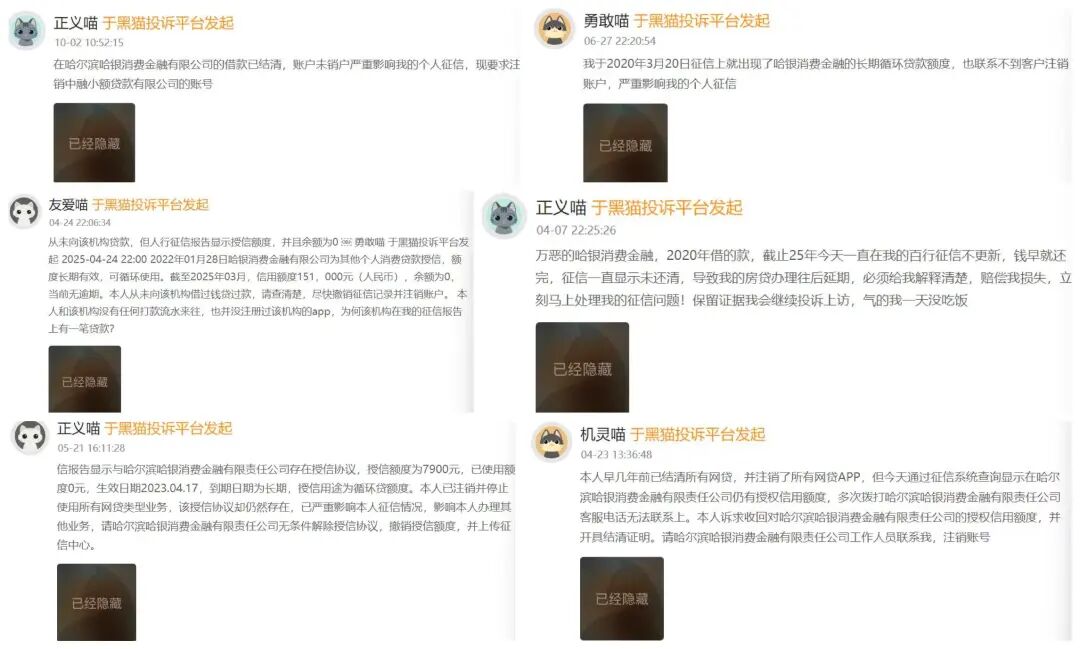 例如,有用戶在還清貸款并注銷賬戶后,征信報告中仍顯示有哈銀消費金融的貸款記錄與授信余額;另有用戶反映,未使用過哈銀消費金融產品卻被查詢征信或添加授信記錄。這些情況暴露出哈銀消費金融在征信數據采集、報送、更新環節存在嚴重漏洞。