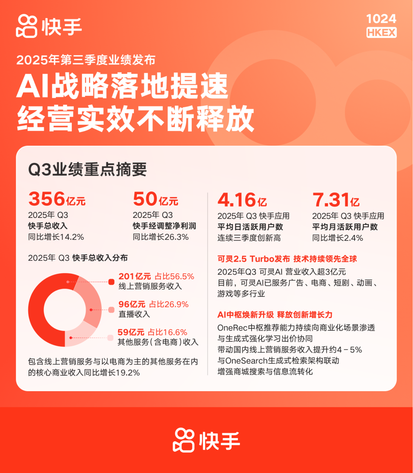 本季度,快手將AI技術在內容生態與商業場景中持續深化落地,實現從內容理解、推薦分發,到投放決策優化、人貨匹配升級、商家經營等關鍵環節的全面提效。端到端生成式推薦大模型OneRec等中樞能力在內容生態中成熟應用后,進一步向線上營銷、電商等商業場景拓展,為增量增長提供長期動力;同時,平臺也在直播場景探索AI驅動的互動產品以豐富用戶體驗,共同推動主營業務實現高質量增長。