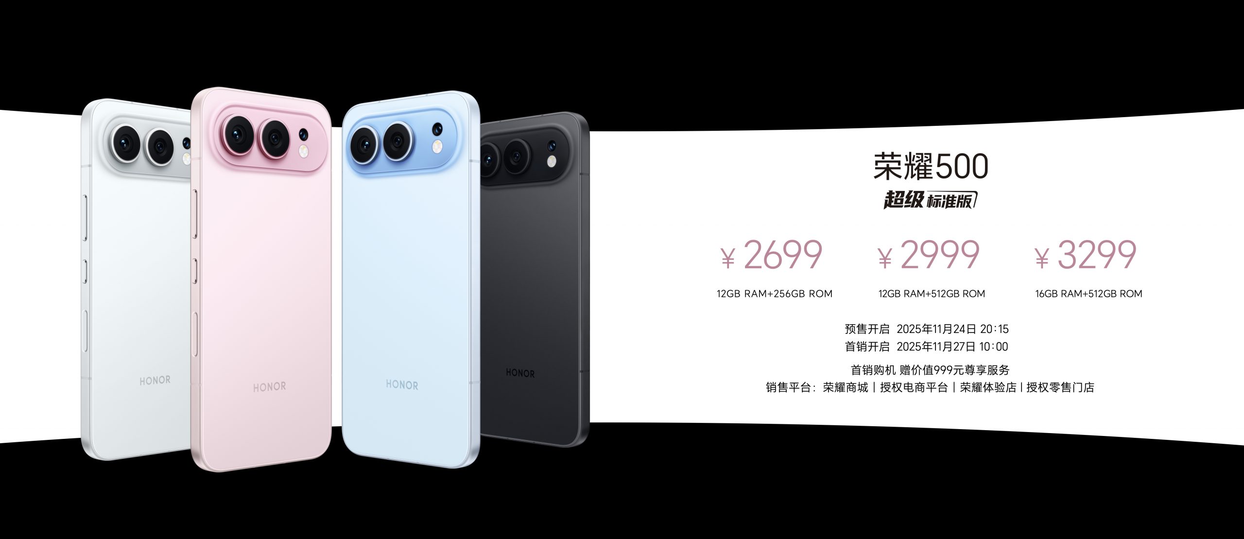 速途網11月24日訊(報道:喬志斌)11月24日,榮耀500系列在杭州正式發布,該產品系列在“影像、性能、續航、外觀、體驗”等方面實現全維升級突破,重塑檔位標準。榮耀500系列共兩個版本,分別為榮耀500超級標準版與榮耀500超級Pro版,起售價分別為2699元、3599元,目前已經開啟預售,11月27日10:00全渠道正式開售。