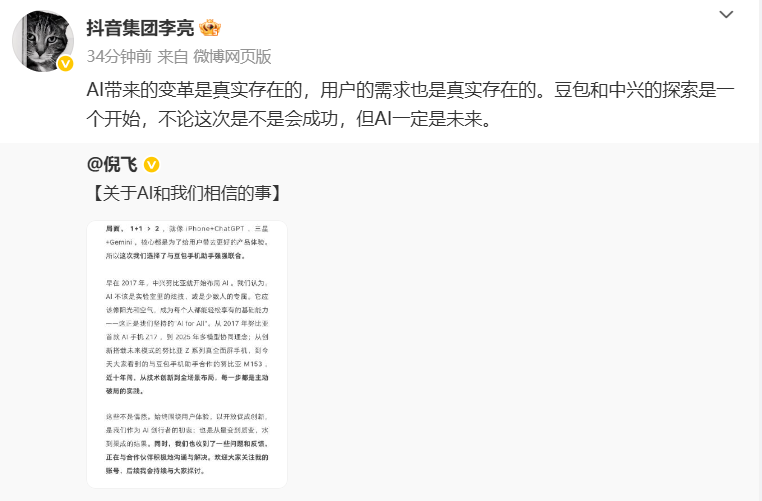 速途網(wǎng)訊 剛剛,針對近日豆包AI收集引發(fā)的一系列“爭議”問題,努比亞技術(shù)有限公司總裁倪飛發(fā)長文回應(yīng),“手機行業(yè)缺乏顛覆式創(chuàng)新,AI手機是明確發(fā)展方向。”抖音集團副總裁李亮轉(zhuǎn)發(fā)力挺。